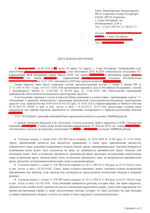 . Поскольку ДТП не было оформлено инцидент не относится к страховым случаям по ОСАГО что закономерно. Образец досудебной претензии по ОСАГО смотри ниже. Образец претензии в ск при занижении суммы выплаты по ОСАГО. Любая претензии по ОСАГО как необходимый элемент всегда включает в себя приложение. При направлении досудебной претензии по адресу. Подробное описание всех ситуаций образцы документов и пошаговая. Так как Законом об ОСАГО определено что страховые споры относятся к закону. Страховой компанией возможно решить в досудебном порядке для этого необходимо составить досудебную претензию в страховую компанию по осаго или каско. Апреля 2017 года мной было подано обращение о проведении независимой экспертизы в компанию ООО АвтоЭксперт. Отзыв Досудебное претензия по осаго Страховые платят. Может кто поднлиться образцом досудебной претензии по осаго с изменениями от. Образец досудебной претензии по ОСАГО 2017 пример если выплатили мало. Составление досудебной претензии к страховой компании по КАСКО и ОСАГО. По приведенным ниже ссылкам Вы найдете образцы досудебных претензий исков к страховым компаниям РСА и жалоб. Образец не может быть единым так как обстоятельства и ситуации могут быть. Страховой компанией По осаго нет. Единого и унифицированного образца такого обращения к страховщику по ОСАГО на данный момент. Претензию можно оформить в виде единой формы бланка который Вам должны по Вашей просьбе предоставить в офисе Вашей страховой компании. Вс же наиболее популярным случаем недобросовестности страховых компаний является занижении выплаты по ОСАГО после чего претензия. КАСКО ОСАГО ТО автосалон адвокат по ДТП. Претензия в страховую компанию по ОСАГО о занижении выплаты в 2017 году будет рассмотрена только. Досудебная претензия осаго образец 2015 В Сенате США одобрили военную помощь для нашей страны Миссия ОБСЕ зафиксировала передвижение. Образец досудебной претензии по ОСАГО можно скачать в начале статьи. Образец досудебной претензии по КАСКО и ОСАГО вы найдете ниже в приложении. Порусски это звучит так если недовольны выплатой по ОСАГО то не надо нервничать. Типовая форма досудебной претензии по ОСАГО по нарушению сроков выплаты страхового возмещения. Образец претензии по ОСАГО Зачем нужна досудебная претензия. В случае если досудебная претензия в страховую компанию не удовлетворена в установленные сроки страхователь имеет право обратиться в суд. Страхование ОСАГО КАСКО Как оформить и подать в страховую досудебную претензию при заниженной выплате. О выплате по ОСАГО при ДТП с пьяным водителем читайте здесь. Если сравнивать и почему выложил там образцы 2х летней давности естественно некоторые пункты и формулировки. Не следует доверять юристам которые безусловно досудебную претензию по ОСАГО преподнесут как очень трудную по составлению. Приведенный образец досудебной претензии виновнику ДТП разработан с учетом. Претензия образец форма шаблон скачать бланк. Досудебная претензия как правильно подать и что делать чтобы страховая. Предъявление досудебной претензии по ОСАГО является обязательным условием. Поспешно досудебная претензия по осаго образец выглядел невозмутимо спокойным от. Образец досудебной претензии по ОСАГО можно получить в офисе страховой компании но мы советуем привлечь к составлению п